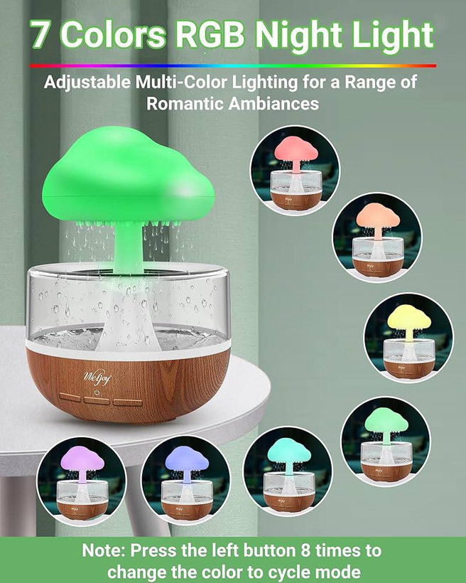 آبنما و چراغ خواب شبیه ساز باران طرح قارچ دارای قابلیت تغییر نور است و دارای ارتفاع 24 سانتی متر قاعده به ضلع 17 سانتی متر است. همراه خود یک کابل USB دارد که هر منبع دارای USB توانایی اتصال دارد